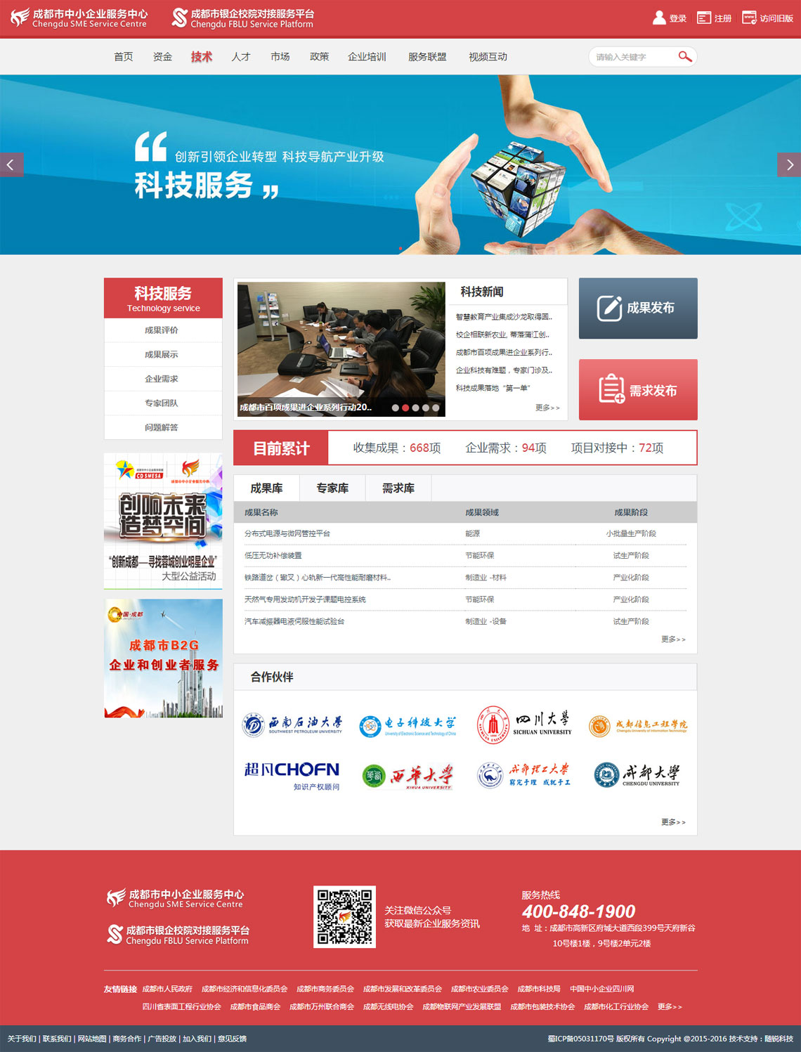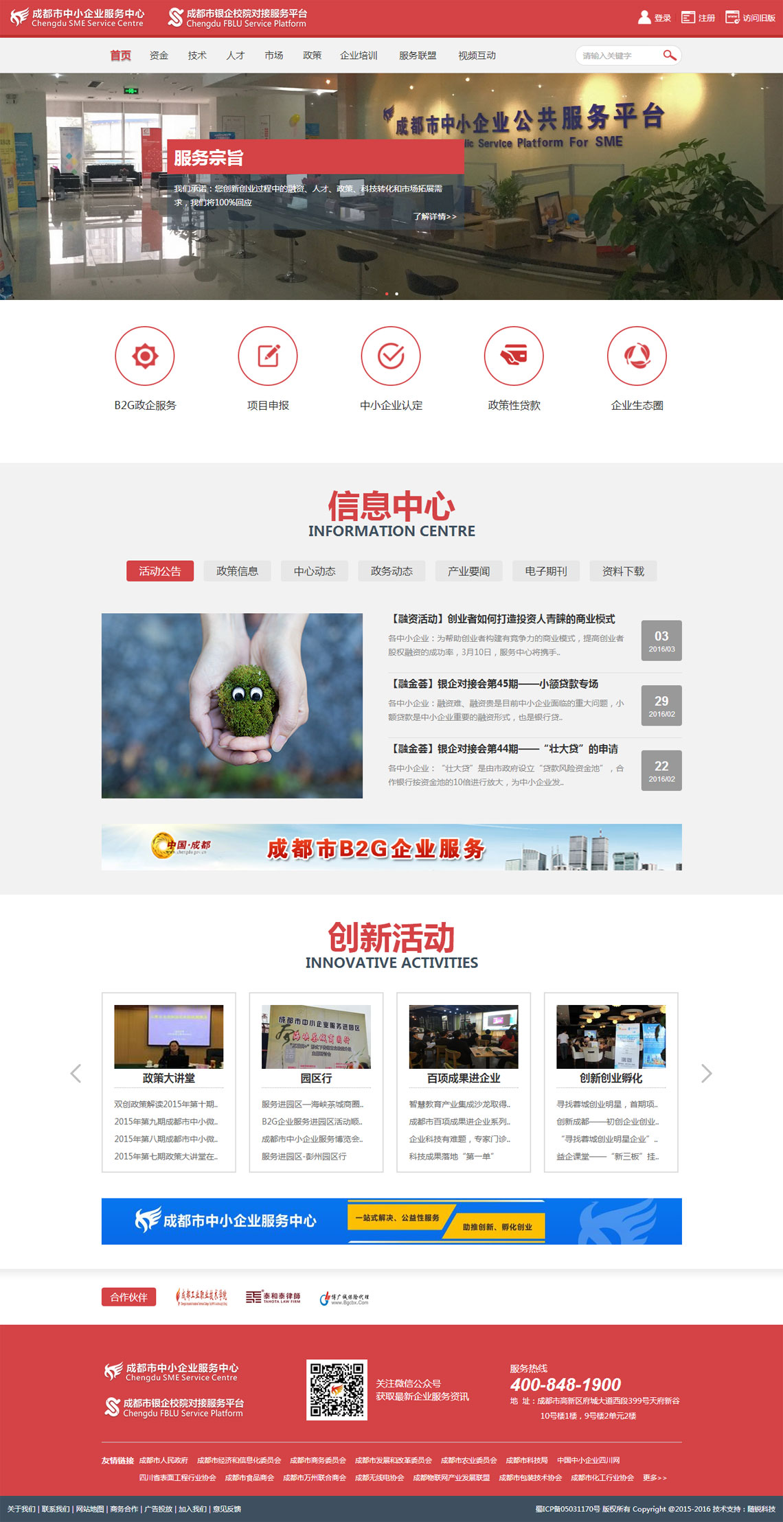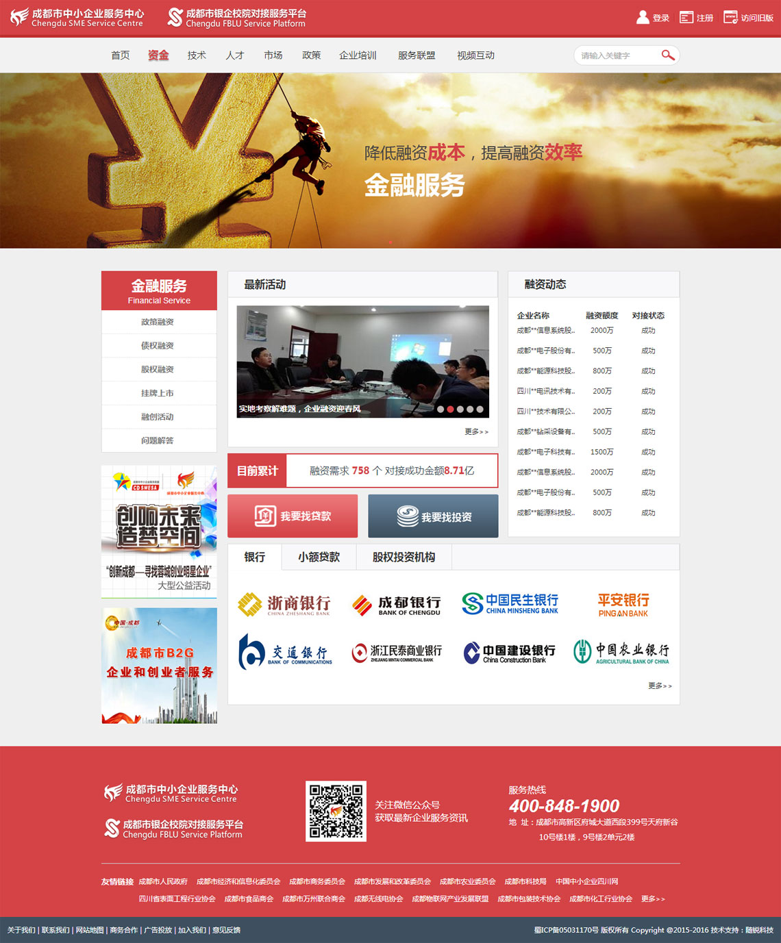 2014年,为深化产业与金融结合,企业与校院合作,完善政策支持,应成都市中小微企业银企校院对接工作推进小组要求,服务中心负责承建成都市银企校院“四方”对接服务平台。平台以服务成都市中小微企业为服务目标,通过打造实体大厅、线上平台及流动服务平台整合政策、资金、信息、机构四项资源,为不同成长阶段的中小微企业提供包括金融、科技、市场拓展、人才、信息五大方面的多层次、多元化、多渠道的公共服务,切实解决中小微企业融资难、融资贵的问题,力争实现政策、信息与企业畅通的突破,促进成都市中小微企业加快发展。